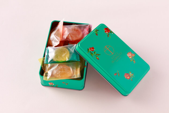 鮮やかなターコイズグリーンに赤いバラが映える缶はこのゼリーだけの限定