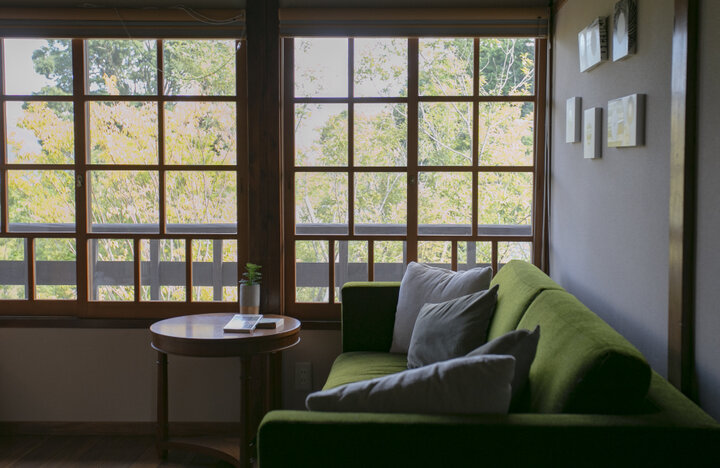 エメラルドグリーンの家具が建物と調和する1階の部屋