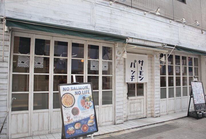 名古屋市中村区、名古屋駅から徒歩5分ほどの場所にオープンした「サーモンパンチ名駅店」。白いヴィンテージ風の外観が目印のこちらのお店は、サーモン料理の専門店。「NO SALMON NO LIFE」と書かれた看板もあり、カフェのような明るい雰囲気のお店です。