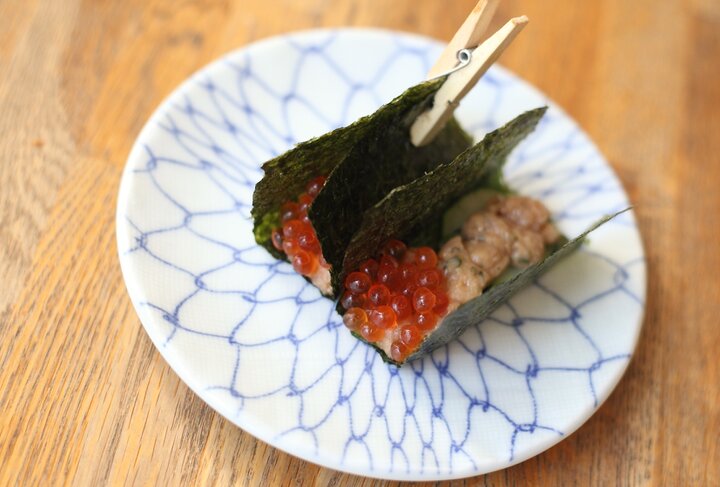 いろいろ楽しんだ最後にもぺろりと食べられそうなのが、一度漬けにしてから軽く炙り、さらに半日ほど置いて仕上げるという“炙り漬けサーモン”を使った卵かけご飯。サーモンの甘味が引き出されていて生とはまた違った味わいです。イクラも漬けにしてあり、醬油を掛けなくても旨味たっぷりでどんどんご飯が進みます。
