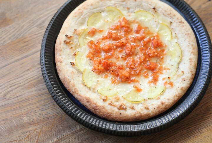 もちろん鮭フレークも自家製していて、グリルでサーモンを塩焼きし、骨を丁寧に取り除いて作り上げ、美味しさを追求しています。鮭フレークと蜂蜜レモンを組み合わせたピッツアは、レモンの酸味や蜂蜜の甘味がサーモンの旨味と重なり、後引く美味しさ。もっちりした生地とも相性抜群です。