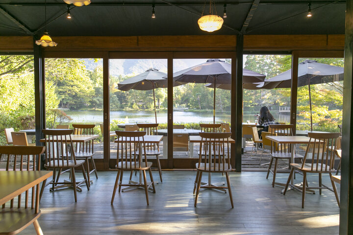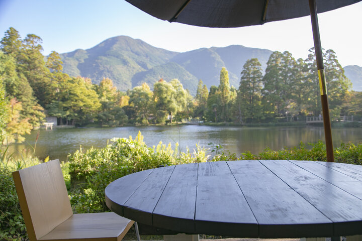 店内は、金鱗湖を一望するテラスが人気の特等席。ガラス張りの店内から初夏は新緑、秋は紅葉を映し出す湖面の風景が広がっています。