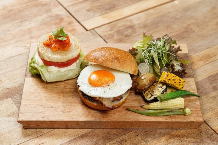 ランチでは、そんなこだわりの自家製パンを使ったハンバーガーが人気。旨味とジューシーさを兼ね備えた豊後牛とベーコン、フレッシュ野菜、香ばしく焼いたバンズが相まって絶品です。たっぷり添えられた野菜もうれしいポイントです。