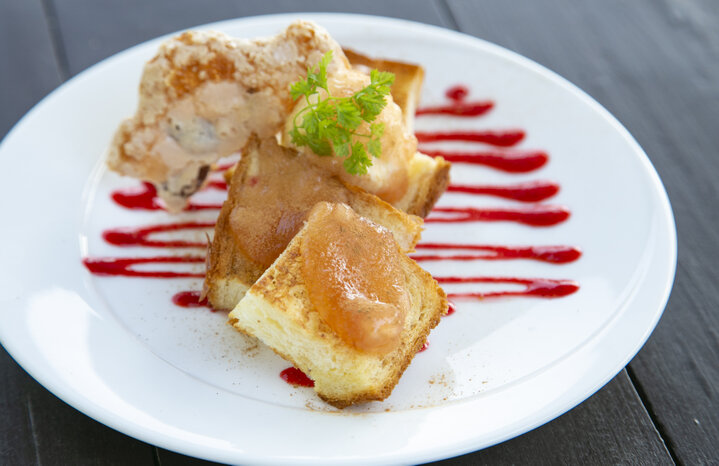 ティータイムには、シナモン林檎トーストがおすすめ。シナモンと旨味が詰まったリンゴジャムをトッピングした食パンに、ラズベリーソースとアイスクリームの取り合わせが絶妙な味わいです。香ばしいアーモンドフレーバーのクロッカンがいいアクセントになっています。