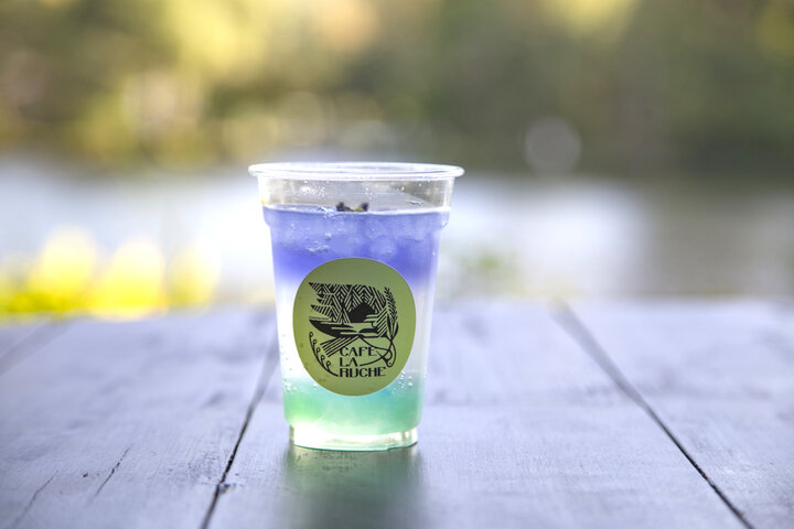 大分県産のオーガニックシロップを使った「カボスソーダ」など、季節限定のドリンクにも注目です。7月から11月までは「カボスの錦玉羹と琥珀糖のYUFUINハーブソーダ」が登場。由布院のハーブで作った自家製シロップを炭酸で割ったこのドリンクは、すっきりした飲み口にカボスの錦玉羹がほのかな甘味をプラスしてくれます。バタフライピーのブルーと、カボス錦玉羹のグリーンのグラデーションで見た目も爽やかです。