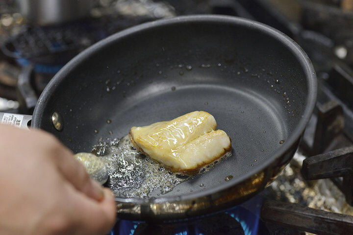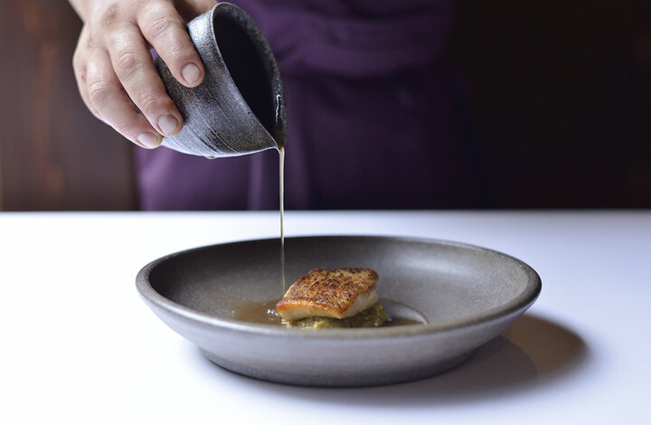 ノドグロのグリルには、テーブルの上でソースが注がれる。このシンプルな組み合わせが奥深い味わいを生み出す。