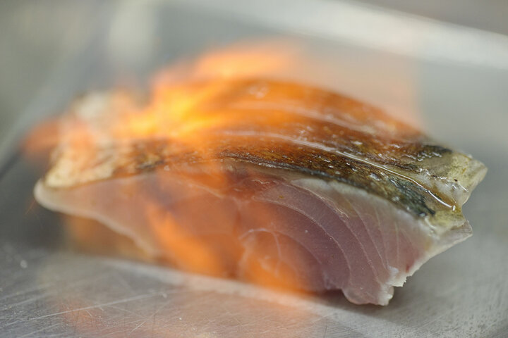 朝市で仕入れたサバはごくあっさりと〆て、表面はこんがりと炙る。