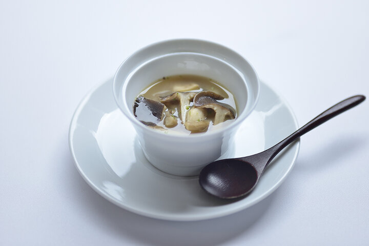 七面鳥とキノコから抽出された濃醇なうま味は、身体の隅々に染み渡っていくよう。みかんの皮でつけられた柑橘の香りを残して、心地よい余韻がいつまでも続きます。 さらに、キノコの下には、茶碗蒸しのサプライズが。卵はやはり七面鳥のもの。ひと匙ひと匙をしみじみと味わう取材班に、池端氏は「慈悲深い……ですかね? 僕は慈悲深い味だと思いました」と問いかけます。なるほど、“慈悲深い”とは言い得て妙。やさしさに包まれ、自分も自然とやさしくなれるような感覚が、そこにありました。