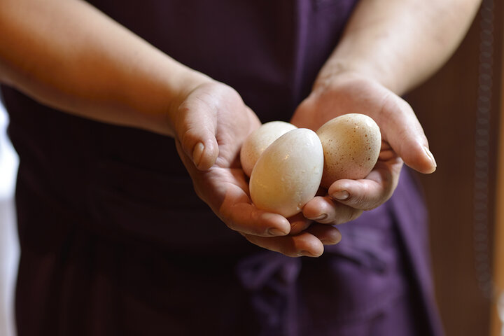 茶碗蒸しに使った七面鳥の卵。その味わいは、鶏卵と比較にならないほどまろやか。