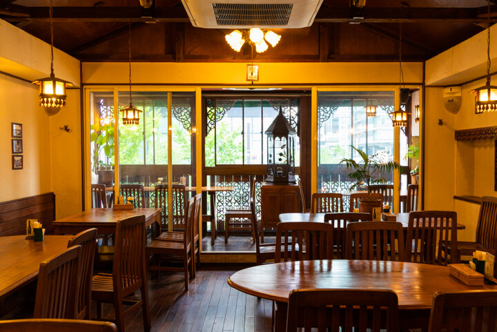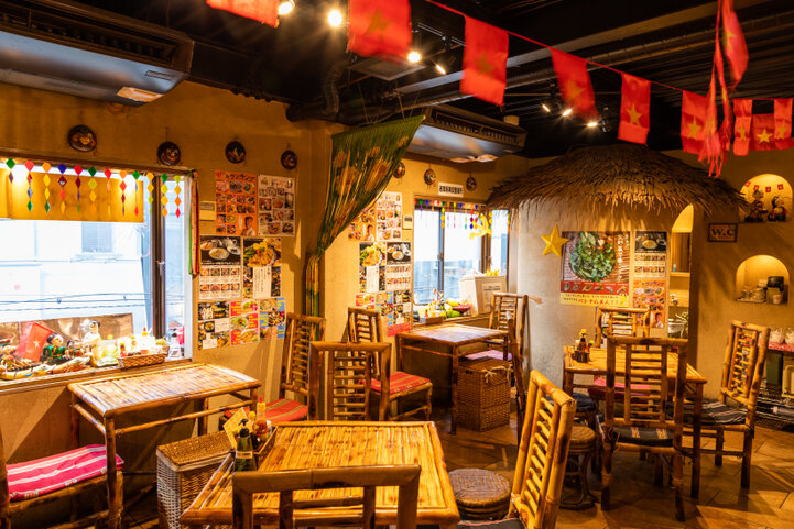 バンブー家具がエスニックな雰囲気を醸し出す店内