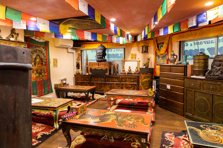 タルチョ(旗)を掲げ、チベットの伝統的な家具が配された座敷席
