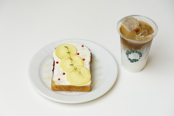 こちらとペアリングで楽しみたいのが「アイスラテ」。信頼を寄せるロースターで豆を焙煎してもらったオリジナルブレンドは、ビターチョコレートのようなしっかりとした苦みを感じられる深煎りコーヒーで、甘いオープンサンドとの相性もばっちり。