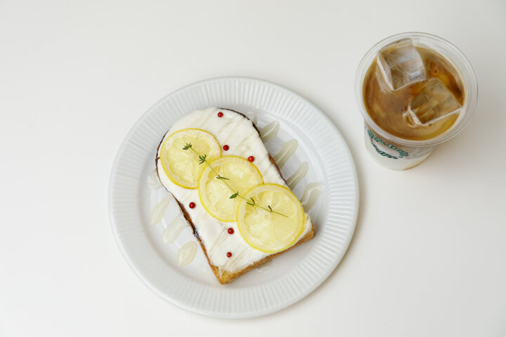 なかでもおすすめは、爽やかなレモンの香り漂う「ハニーレモン」(650円)。バターの上に、クリームチーズを混ぜたオリジナルグリークヨーグルトをたっぷりと載せて、シロップ漬けのレモンをトッピング。はちみつとピリリとした辛さを感じるピンクペッパーで彩り豊かに仕上げています。