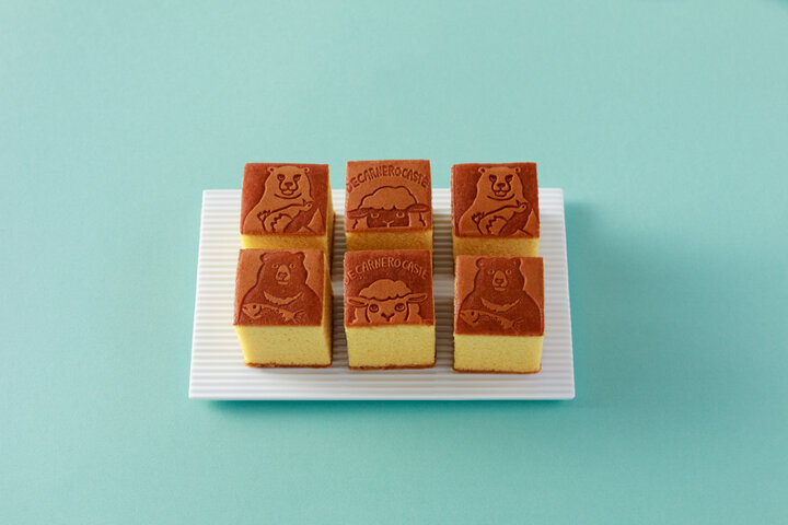 観音開きの箱を開けるとキュートなデザインのカステラが現れて、思わず笑顔に。見た目も楽しい「羊のカスティーリャ」は、三重県の「DE CARNERO CASTE」で生まれたカステラです。かわいい動物の絵柄を中心に、数種類から選べる焼印が特徴。キューブ型にカットしたタイプのほかに、カットなしで大きな焼印が押されたタイプもあります。 焼印のデザインは、岩男はなさんや福田利之さんなど、さまざまな作家さんが手がけていて、バラエティー豊か。季節限定の模様や〝ありがとう〟などのメッセージもあり、贈り物にもぴったりです。