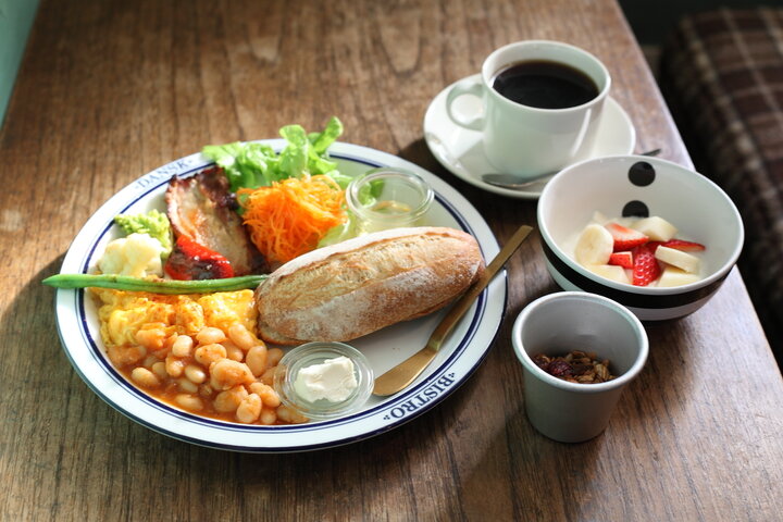 近くにある湯の山温泉周辺に素泊まりの宿があったことから「カフェスナッグ」ではモーニングの営業をしています。パンとドリンクのセットやサンドイッチのほか、スペシャルな朝食をと考案したのが、パンやグラノーラ、ベーコンなどすべて自家製仕上げた「イングリッシュブレックファースト」。イギリスの家庭料理である白いんげんの煮込みやスクランブルエッグのほか、地元野菜を使った総菜なども盛り合わせたプレートになっていて、栄養バランスも抜群です。