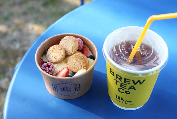 「カフェスナッグ」ではアイシングクッキーのほかにもケーキやドリンクなどほとんどがテイクアウトできます。ころんとかわいいクッキーがトッピングされたパフェは自家製グラノーラやアイスで食感も楽しい一品。イギリスのメーカーから取り寄せているという紅茶も、オリジナルのテイクアウトカップがおしゃれで、デザインでも楽しませてくれます。