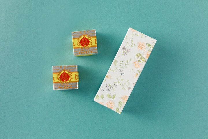 レトロで豪華なデザインの、きらきら光る銀色の包みを開けると、5センチ四方、高さ3センチの、どっしりとした四角いケーキがお目見え。ホワイトチョコレートでコーティングされたスポンジをひと口かじれば、ふわりと、白いんげん豆のジャムの優しい甘さが口の中に広がります。 鈴屋は創業90年以上の歴史をもつ和・洋菓子店。看板商品の「デラックスケーキ」は、素朴なおいしさはもちろん、キューブ状の可愛いパッケージも魅力。幼いころに「いただきもの」をもらった時の感覚がよみがえり、包みを開ける際にはちょっとしたタイムスリップ気分を味わえそう。