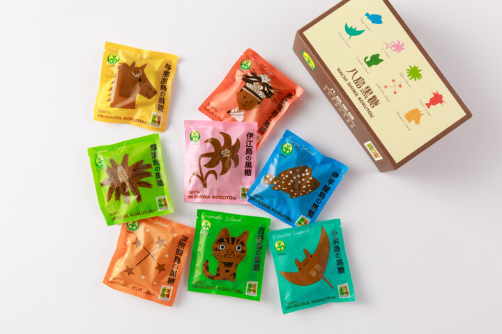 カラフルなパッケージに、チョコのような色で描かれたポップな動植物のモチーフ。「八島黒糖」は、沖縄の8つの島で作られたサトウキビをそれぞれ、生産地域にある工場で煮詰めて作ったブランド黒糖のセットです。 それぞれの島で育まれたさとうきびから作るため、味、香り、食感に色まで、シングルオリジンのスペシャルティコーヒーのように個性豊かです。例えば、宮古島と石垣島のあいだに浮かぶ多良間島の黒糖は四角形で固め。味わいがギュッと詰まったような濃厚さです。日本最南端の島波照間島の黒糖はゴツゴツとして大粒なのに、さらっと溶ける軽い口当たり。ひと口に沖縄の黒砂糖といっても風味が少しづつ異なるのに驚きます。