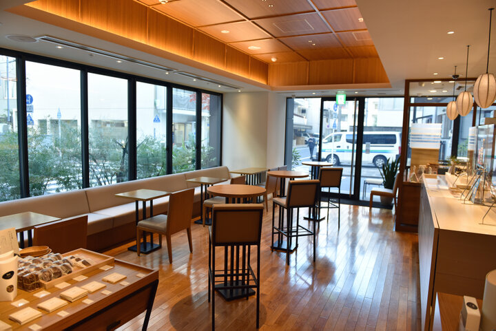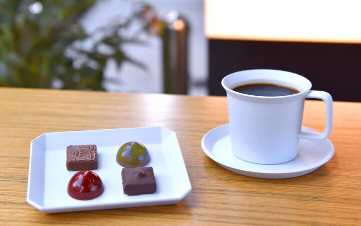 店内は、黒を基調にしながらも木の温かみを感じます。カカオ形のペンダントライトは和紙で作られていて、チョコレートがゆったりと並ぶショーケースは和食店のカウンターのよう。使われている食器はマットなテクスチャの有田焼と、ところどころに日本らしさを感じてどこかホッとするような雰囲気です。