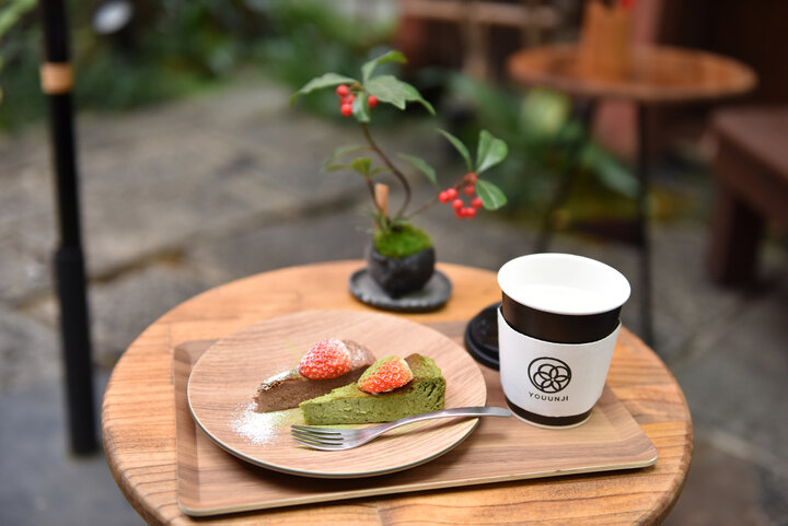 寺務所前にあるテラス席では、朱色の野点傘や紅葉が艶やかな雰囲気を作り出し、非日常的な時間を過ごせます。山門の脇には、黒を基調とした落ち着いた雰囲気のテラス席もあるので、自分のお気に入りの席を見つけてみるのも楽しいですね。
