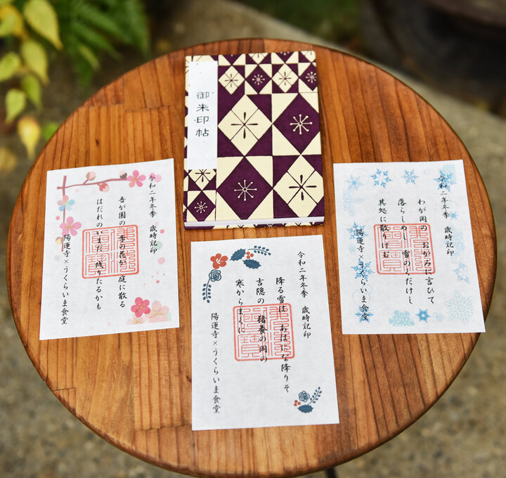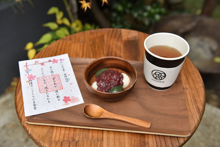 「歳時記ご朱印付きご縁餅セット」はご朱印巡りをしている方にも人気です。ご朱印は陽運寺のご住職が制作したもので、万葉集の和歌が書かれています。デザインと歌が異なる3種の御朱印から選べますよ。 注文を受けてから作られるお餅は、ほかほかと温かくもちもちの食感。トッピングの小豆のつぶ餡がちょうど良い甘さでお餅とも相性ばっちりです。「ご縁があるように」と5つのお餅が入っているので、見た目以上にお腹が満たされます。