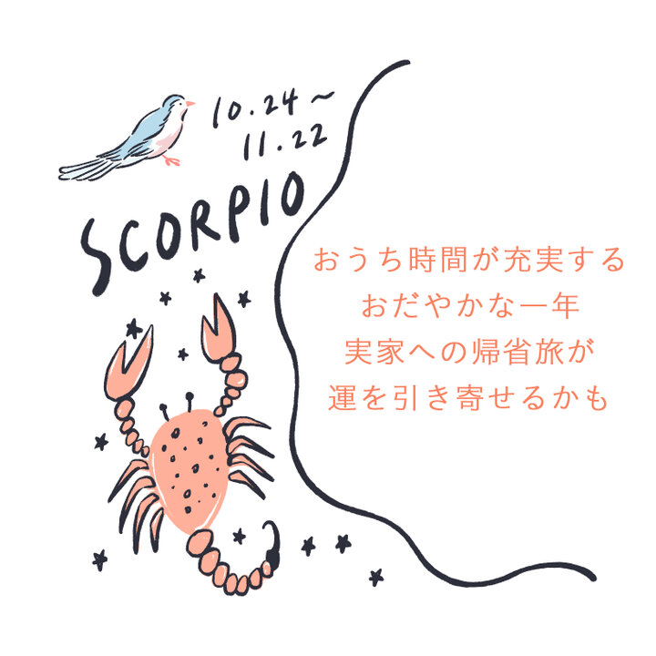 ストッパーを取り除き、新しい世界へと飛び出していく時が来ました。今までの当たり前が通用しなくなる「風」の時代に向け、自分の殻を脱ぎ捨てて、心の扉を開け放ちましょう。来年のてんびん座は「遊び心と自己表現」がテーマ。ワクワクと心が躍るものに情熱を注ぎ、夢中になって駆け抜ける充実した1年が待っているでしょう。ファッションが好きな人は個性的な服を身にまとったり、今までトライしたかったヘアスタイルにチェンジしたり、まずは外見的なことから大胆に自分を表現してみて。 フリーランスの人や新しい出会いを求めている人は、SNSの写真をアップデートするのもおすすめ。憧れている人から思いがけないラブコールを受けるかも。