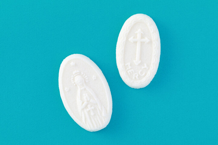 中にはマリア像と十字架があしらわれた落雁が5つ。聖母マリアをイメージさせるやさしいミルク味と、西洋の風味であるミントをアクセントにしたミルクミント味の2種の味が楽しめます。 さっくりとした食感の生地は、食べると口の中でやさしい甘さとともに溶けていきます。西洋の風味であるミントを合わせることで、緑茶はもちろん紅茶など幅広いお茶とも相性抜群。おしゃれなパッケージは贈り物にもぴったりです。