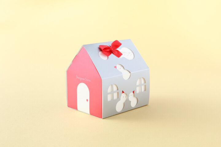 家の形をした箱に結ばれた赤いリボン。銀色のスリーブはひょうたんのような形と窓がカットされ、下の白い箱に重ねると赤い三角帽子をかぶった小さな雪だるまが現れます。まるで銀世界に包まれた雪だるまの家を思わせるパッケージが、ずっと見ていたいかわいらしさ。 「白銀サンタ」は、雪国・新潟生まれのクッキー。丸が二つ並んだような形も、白い生地も雪だるまがモチーフです。白いクッキー生地が口の中でやわらかくほどけ、中のフランボワーズソースがクッキー生地に絡み、甘酸っぱいおいしさ広がります。ひとすじデコレーションされたホワイトチョコの甘さもアクセント。