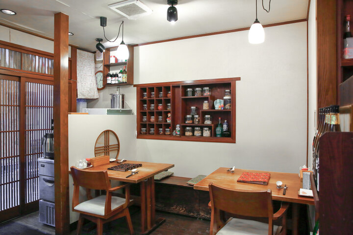 のれんをくぐれば、一見カフェと見間違えるかのようなおしゃれな空間が広がります。1階には、テーブル席が2卓とカウンター、2階はお座敷に円卓が並びます。店主の曽根章宏さんは、元々はホテルの中華料理店で腕を振るっていたのだそう。そのホテルが閉館されるタイミングで独立され、お店の名前もそのまま引き継いだのだとか。現在でも当時の常連さんが足を運ぶこともあるそうです。
