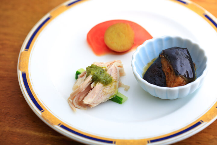 まず前菜は、さつまいもの甘煮、なすの中華風和え物、蒸し鶏の山椒ソース添えの3品。いずれも冷製の料理が少しずつ盛られています。