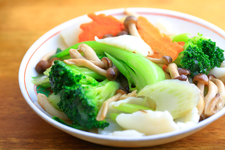 3品目は、イカと旬野菜の炒め。野菜は、ブロッコリーやちんげん菜、セロリ、にんじん、しめじと盛りだくさん。塩とナンプラー、少しのグラニュー糖で仕上げたあっさりとした味付けですが、ほんのりとろみがついているので、具材によく絡み、しっかり味を感じることができます。