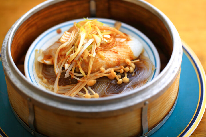 続いては、蒸しもの。この日は、カラスガレイに春雨やえのき、白ネギを添えたもので、ナンプラーや中国たまり醤油で味付けています。隠し味に加えたグラニュー糖とネギ油で、より奥深い味わいに。蒸しものは、日によっては揚げものに変わることもあるので、訪れるたびに楽しみが広がります。