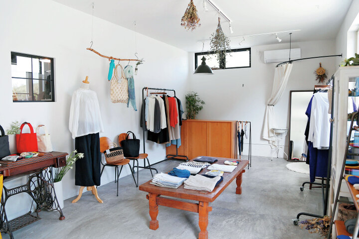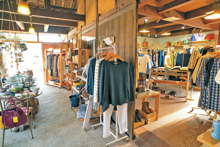 「癒やし」をテーマに、天然素材の服や作家の器、植物やガーデニング用品まで、ナチュラルな素材をもとにしたアイテムが並びます。築100年以上の古民家を改装した店内は、オーナーの手作りで、あたたかみのある空間です。