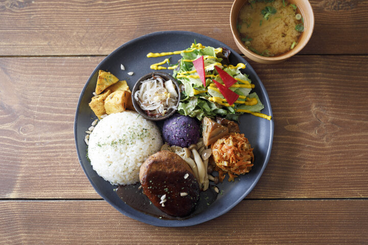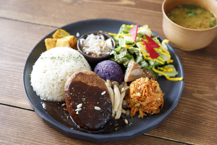 ランチの人気メニューは「mumokutekiプレート」。ワンプレートにメインとデリ、サラダ、ご飯を盛り合わせており、味噌汁が付きます。 メインは豆腐とおからこんにゃく、オニオンソテーなどたっぷりの野菜で作った豆腐ハンバーグ。豊かな味わいと食感で、肉に負けないくらい食べ応えがあります。濃厚でコクのあるデミグラスソースも、使っているのは植物性原料のみ。 豆腐ハンバーグ以外にも、メインはおからこんにゃくを使った「おからあげ」と「味噌カツ」の3種の中から選ぶことができます。 有機野菜を使ったデリは6種類。さまざまな味つけでたっぷりの野菜を楽しめます。 ご飯は自社農場「mumokuteki farm」で育てた無農薬・無化学肥料の米を使用。料理を構成する食材ひとつひとつがこだわられています。