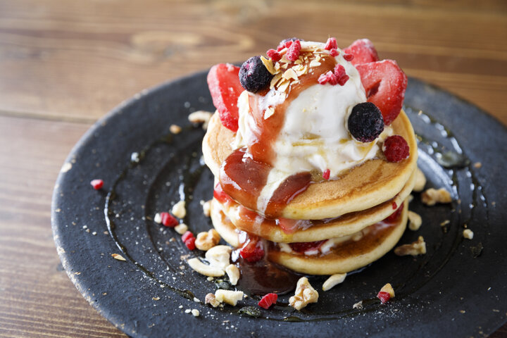 パフェやケーキといったスイーツも豊富です。中でもおすすめは「いちごのパンケーキ」。生地には、栄養価が高く人工的な品種改良が行われていないスペルト小麦を使用。外はさくっと、中はふんわりとした食感がクセになります。 パンケーキの間に挟まれた濃厚なカスタードクリームは、卵・乳製品不使用。甘すぎずさっぱりとした味わいの豆乳ソフトが上にのり、添えられたいちごやブルーベリー、ナッツがアクセントになっています。 安心安全のメニューがうれしい「mumokuteki cafe & foods 京都店」。 同じ建物の1階や地下1階ではアンティークやナチュラル系雑貨、洋服などを販売しているので、ぜひカフェと一緒に立ち寄ってみてくださいね。