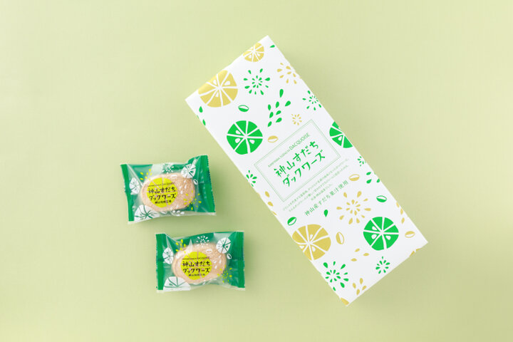 ゆったりした山並みと田園に囲まれた徳島県の神山町。神山温泉は自然豊かな里山に湧き出る名湯として知る人ぞ知る温泉です。その昔、天女がこの地に現れ霊水を湧き出させたと伝わり、古くからいやしの湯として地元で愛されています。温泉を目指して県外からも多くの人が訪れるとあって、温泉と神山町特産のすだちを合わせたお菓子を開発しようと誕生したのが、こちらの「神山すだちダックワーズ」です。 すだちは徳島県が全国シェアNo.1を誇る柑橘。なかでも神山町はすだちの生産地として県内でも有名です。さらにフランスを代表する温泉地、ダックスが名前の由来となったお菓子のダックワーズをヒントに、神山産すだち果汁を使ったダックワーズを完成させました。パッケージにもすだちをあしらい、神山らしさを表現しています。