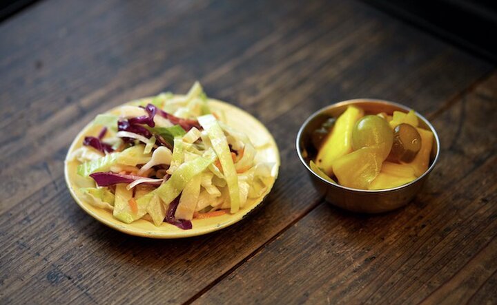 (左)ハンドメイドのコールスロー、(右)ピクルス