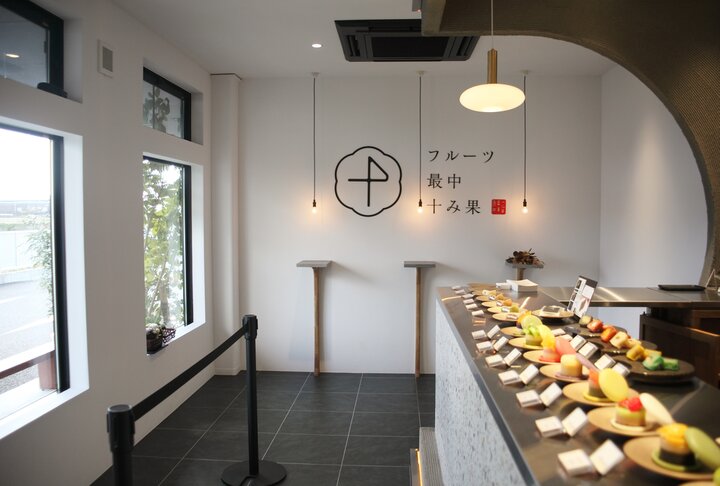 「フルーツ最中 十み果」があるのは、愛知県知立市。国道23号線・上重原ICすぐの場所です。系列店であるカフェなどが並ぶ建物の一角にオープンしました。暖簾がかかった白いエントランスが目印です。