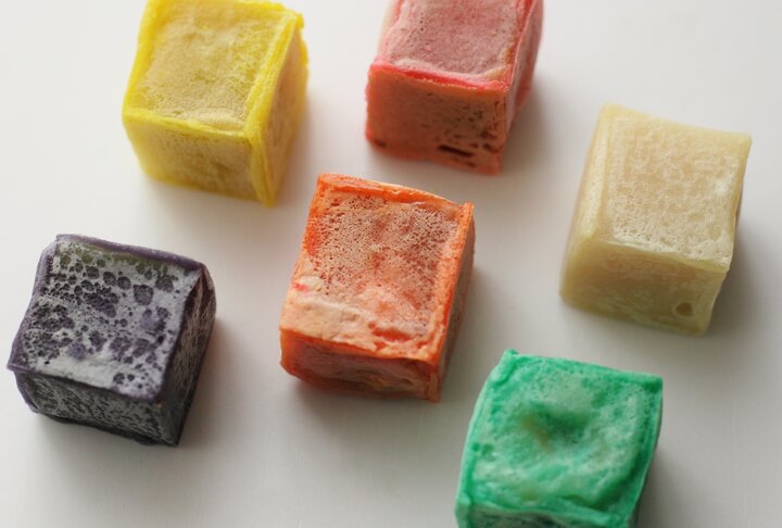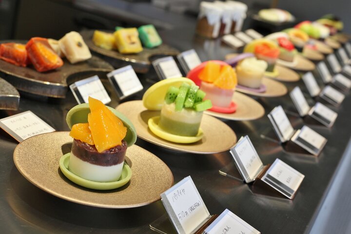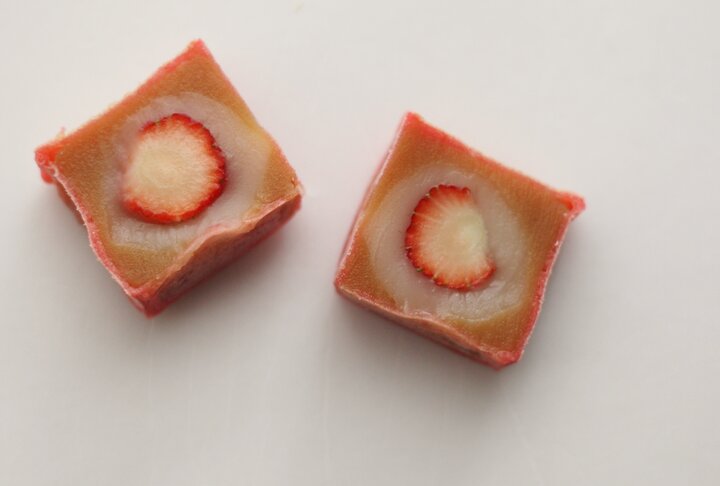 そして、この冬の新作として登場したのが、カラフルな見た目がかわいい「フルーツきんつば」。フルーツを餡で包み、さらに羊羹と一緒に型に入れて四角く成形し、生地を付けて焼き上げています。こちらもフルーツに合わせてさまざまな餡や具材を加えています。