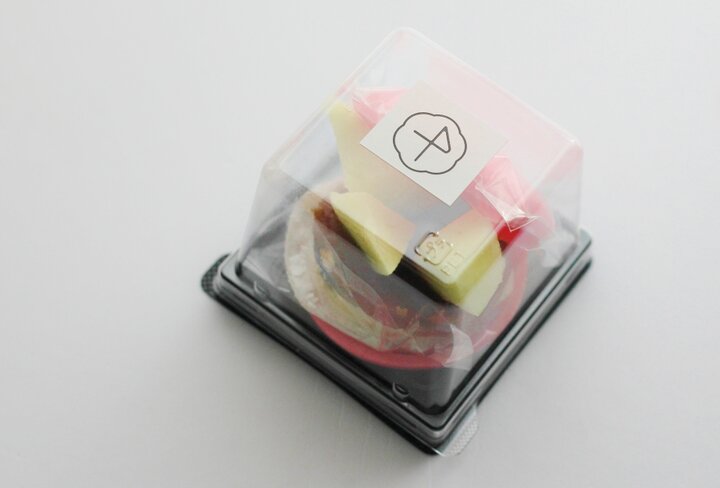 最中は、そのパリパリとした皮の食感も重要なポイント。そのためテイクアウトして家でも美味しく食べてもらえるよう、下に敷いた最中の上の求肥と餡の間にはフィルムが1枚挟んであり、上にのせる皮もフルーツに触れないよう袋に入れてあります。かわいい見た目も保ちながら、最中の食感も大切にする包装を考案しました。