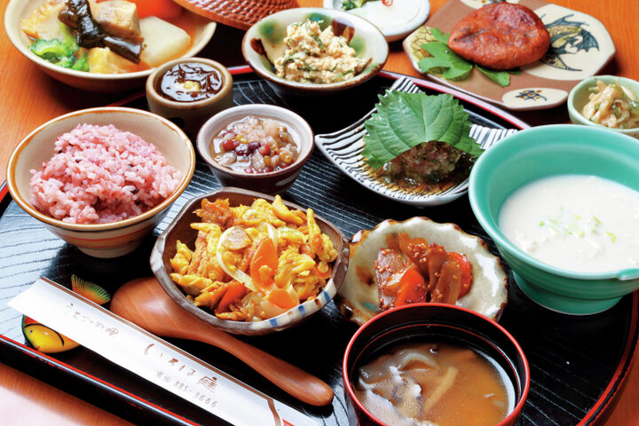 沖縄の自然を感じる中庭を眺めながら、伝統的な料理が味わえます。食材にこだわった定食が中心で、とろけるようにやわらかいラフテーやゆし豆腐など、全10品の石畳定食1620円(昼のみ)がおすすめです。