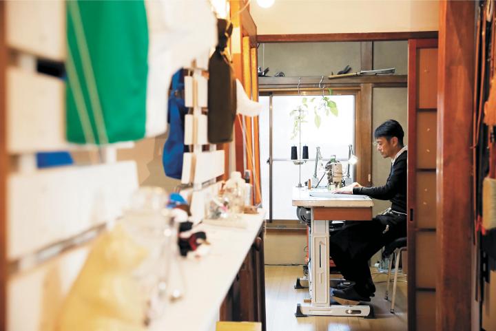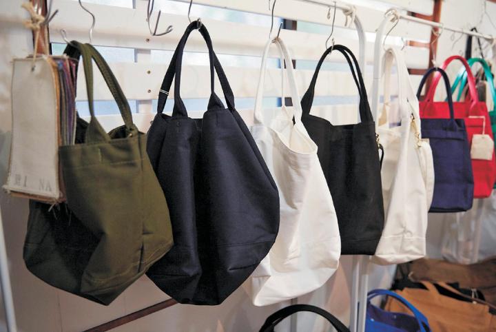 バッグはすべて、こうださんの 手づくり。モノをつくる時間が とても楽しいのだそう
