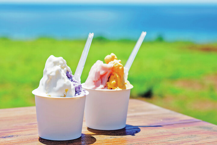 芝生の向こうに広がる青い海を眺めながら味わうのは格別。(左)ミルク&紅芋、(右)グァバ&島かぼちゃ各396円