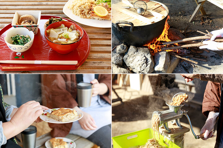 (左上)この日のランチは自家製味噌を使った具だくさんの味噌汁や干し大根の煮物、クミンライスや塩麹に漬けたスモークチキンなど(左下)りんごと紅茶のお手製ケーキとハーブティでひと休み(右上)焚き火で大豆を柔らかくゆで上げる(右下)ミンサーを使って大豆をつぶす