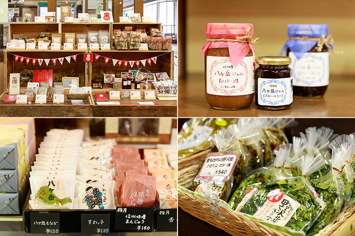 (左上)雑貨や食の加工品など、八ヶ岳の麓で作られたいいものが揃う「八結」のコーナー(左下)昭和8年創業の地元の和洋菓子店「梅月」のお菓子は1つから購入できる(右上)モン蓼科のオリジナルジャムも(右下)信州みやげの定番といえば野沢菜漬け