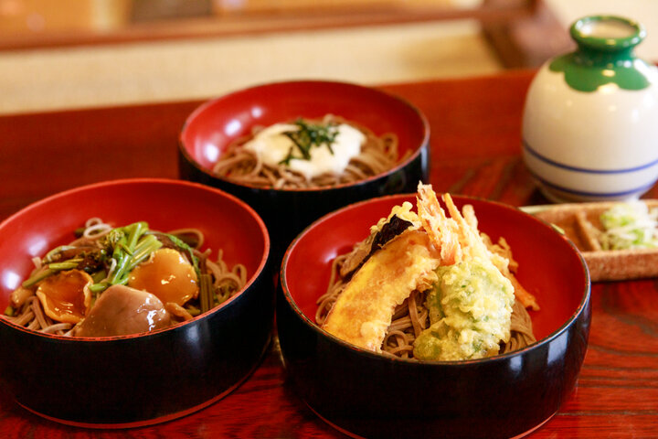 季節の野菜を使った天ぷら、とろろ、山菜が乗った「三段蕎麦」1330円