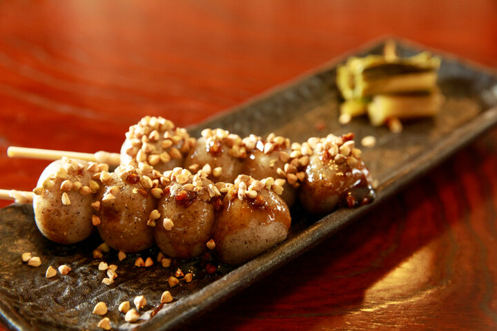 おそばや丼、一品料理以外に、ところ天やそばアイスなどのデザートもあります。人気は、蕎麦つゆベースの甘辛だれがかかったそば団子。ローストした香ばしいそばの実がトッピングされていて、もちもちの団子にカリっとした食感のアクセントを加えています。付け合わせの自家製野沢菜漬けはカルピスを入れて漬けているそう。ほんのりした甘さと酸味があとを引きます。