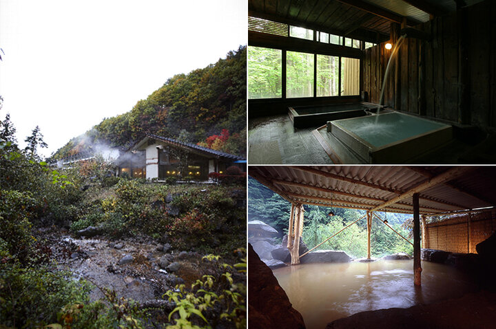 (左・右下)奥蓼科の秘境・横谷峡にある一軒宿「横谷温泉旅館」(☎︎0266-67-2080)。効能豊かな茶褐色のお湯が特徴的(右上)風情のある信玄の薬湯が評判の「渋・辰野館」(☎︎0266-67-2128)は創業100年を誇る秘湯の宿