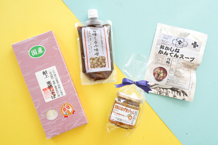 地元老舗店の和菓子や野沢菜漬けといった昔ながらのおみやげから、八ヶ岳山麓の森の中で自家焙煎するコーヒー豆やオーガニックグラノーラなど、新旧取り混ぜたアイテムをラインナップ。なかには、特産の寒天を使ったヘルシーなスナック菓子「おかしなかんてん」といったユニークなものもあります。