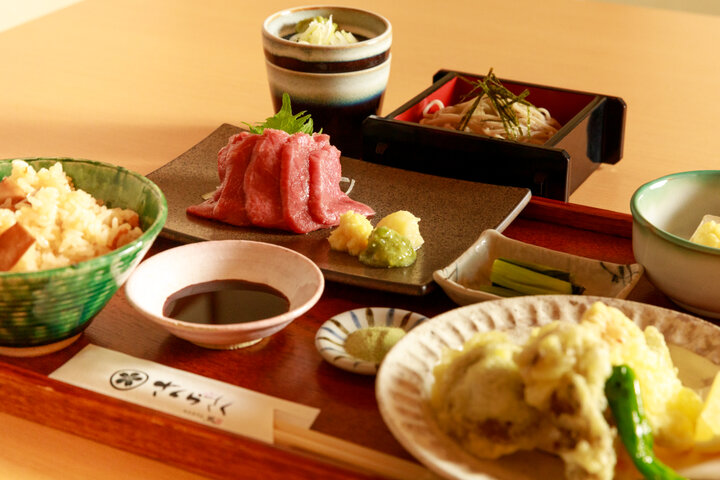 おすすめメニューは、季節の野菜の天ぷらや炊き込みごはん、信州産そばなどが付いた「さくらさく御膳」。クセがなく、柔らかい上赤身の馬刺しは、しょうがやにんにく、安曇野産のわさびの3種類の薬味で味の変化が楽しめます。 もっとお肉を味わいたい人は、ロースやカルビ、モモなどの異なる部位の肉が盛られた「馬刺し三昧定食」(2150円)をどうぞ。定食以外にもステーキや桜鍋、すき焼き、馬カツなど、馬肉料理のバリエーションがとても豊富です。